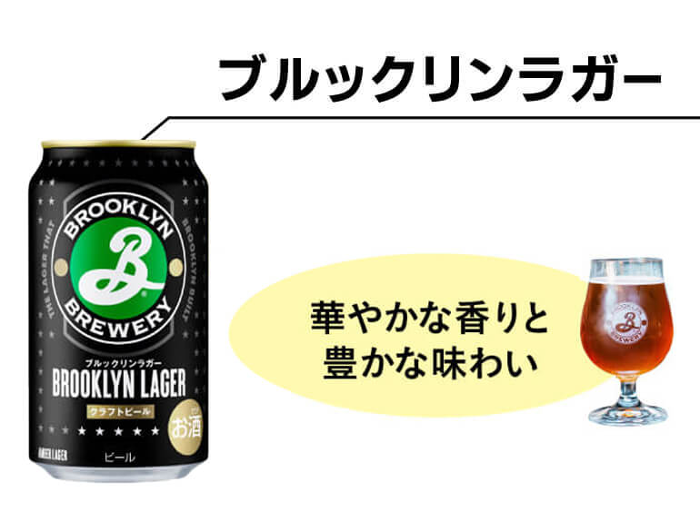 ブルックリンラガーは、19世紀、ビールづくりの町ブルックリンで人気のあった、麦とホップをたっぷり使ってつくるウィーンスタイルのビール製法を継承し生まれた、ブルックリン・ブルワリーで一番人気の商品です。 琥珀色で麦芽の苦味とホップの華やかな香りが際立ち、後味にはカラメル麦芽の風味も感じられます。