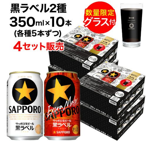 景品付き サッポロ 黒ラベル 2種 350ml×10本入 (各種5本) 4セット 計40本 国産 ビール エクストラモルト うすづくり ビア グラス付き ギフト 長S