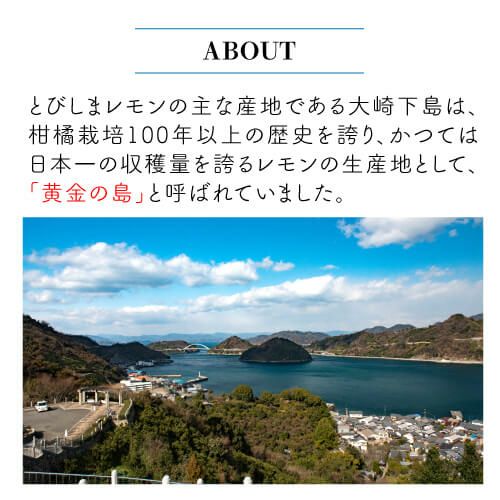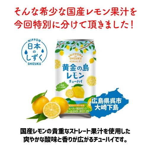 広島県呉市にある大崎下島(おおさきしもじま)は、かつて黄金の島と呼ばれる程、レモン栽培が盛んな島でした。瀬戸内海に浮かぶ島で愛情込めて栽培したとびしまレモンの貴重なストレート果汁を使用しました。爽やかな酸味と香りが広がるチューハイです。
