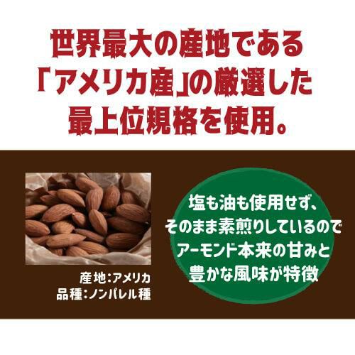 カリフォルニア産ノンパレルエキストラNo1のアーモンドを直火焙煎機にてカリッと食感に!四季折々に合わせ焙煎機の温度調整を職人の経験で調整し美味しく仕上げました。食塩不使用でそもまま食べても、サラダにも、お菓子材料にも最適です。