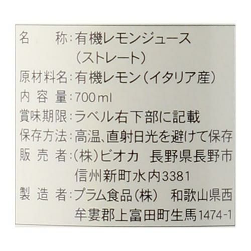 1本あたり1,025円!ケース買いがお買い得! 送料無料 ビオカ 有機レモン ストレート果汁100% 700ml×6本 有機JAS 国内充填 レモン果汁 有機レモンジュース オーガニックイタリア産 カワタキ