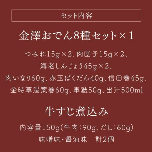1月20日(金)以降のご注文は2月6日(月)以降順次発送予定 送料無料 赤玉おでん 冷凍 金澤おでん8種セット905g (つみれ15g×2、肉団子15g×2、海老しんじょう45g×2、肉いなり60g、赤玉ばくだん40g、信田巻45g、金時草湯葉巻60g、車麩50g、出汁500ml)1セット 約2人前 金澤おでん お取り寄せ おでん 石川 ギフト 産直 産地直送 赤玉(産直)
