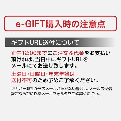■ギフトURL送付について 正午12:00までにご注文&代金をお支払い頂ければ、当日中にギフトURLをメールにてお送り致します。※土曜日・日曜日・年末年始は送付不可のため予めご了承ください。万が一弊社からのメールが届かない場合は、メールの受信設定ならびに迷惑メールフォルダをご確認ください。