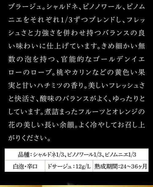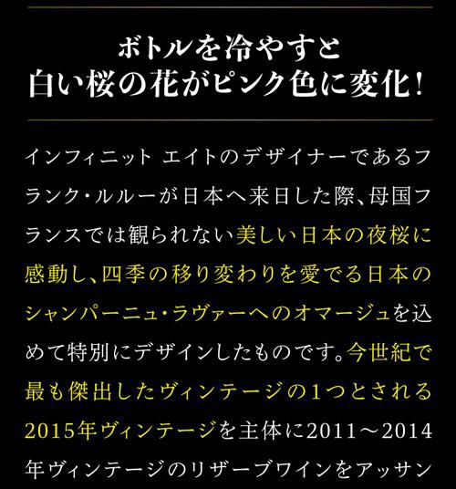 インフィニット エイトのデザイナーであるフランク・ルルー氏が日本へ来日した際、母国フランスでは観られない美しい日本の夜桜に感動し、四季の移り変わりを愛でる日本のシャンパーニュ・ラヴァーへのオマージュを込めて特別にデザインしたものです。今世紀で最も傑出したヴィンテージの1つとされる2015年ヴィンテージを主体に2011~2014年ヴィンテージのリザーブワインをアッサンブラージュ。シャルドネ、ピノノワール、ピノムニエをそれぞれ1/3ずつブレンドし、フレッシュさと力強さを併せ持つバランスの良い味わいに仕上げています。