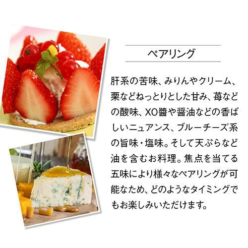 濃密な味わいが際立つデザート日本酒。口に含んだ瞬間から上品できめ細かい甘さが広がり蜜のようにまろやかな質感が舌の上に広がる