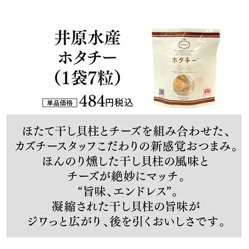 ほたて干し貝柱とチーズを組み合わせた、カズチースタッフこだわりの新感覚おつまみ。 ほんのり燻した干し貝柱の風味とチーズが絶妙にマッチ。 “旨味、エンドレス”。凝縮された干し貝柱の旨味がジワっと広がり、後を引くおいしさです。