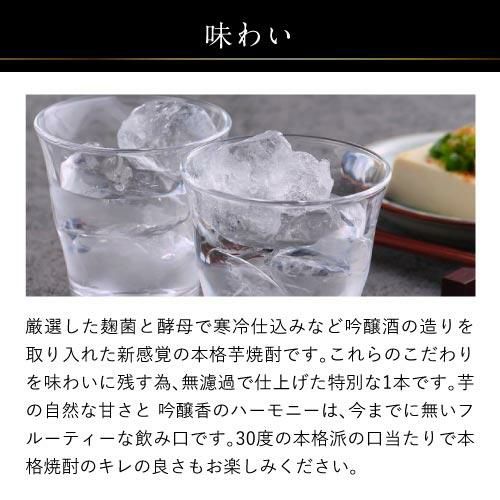 厳選した麹菌と酵母で寒冷仕込みなど吟醸酒の造りを取り入れた新感覚の本格芋焼酎です。 これらのこだわりを味わいに残すため、無濾過で仕上げた特別な1本でう。芋の自然な甘さと吟醸香りのハーモニーは、今までに無いフルーティーな飲み口です。 度の本格派の口あたりで本格焼酎のキレの良さもお楽しみください。