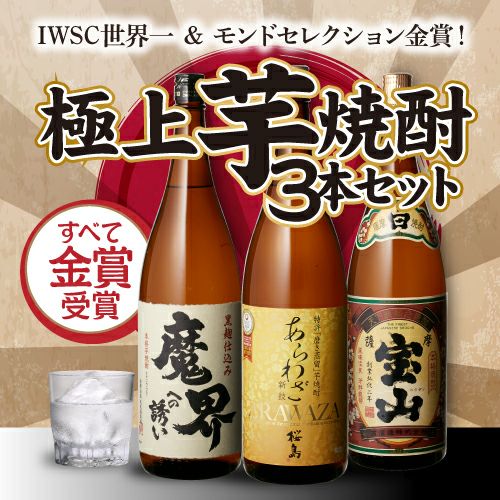 送料無料 芋焼酎セットIWSC世界一&モンドセレクション金賞!すべて金賞受賞!芋焼酎1.8L 3本セット桜島 あらわざ 薩摩宝山 魔界への誘い 1800ml 一升瓶 本格芋焼酎 いも焼酎 父の日 時間指定不可 焼酎セット IWSC世界一&モンドセレクション金賞! すべて金賞受賞 芋焼酎1.8L 3本セット 長S