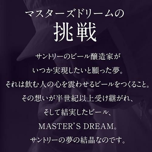 蒸溜所とそこでつくられるウイスキーの魅力をお伝えしたいとの思いから山崎のプレミアムハイボール缶が数量限定で登場。ハイボールに合う山崎モルト原酒のみを厳選して使用した、厚みのある味わいとスパニッシュオーク樽由来の華やかで濃厚な味わいが特長です。“心が震えるほどにうまいビール”醸造家のこだわり・思いが込められたマスターズドリームと一緒に是非ご賞味ください。