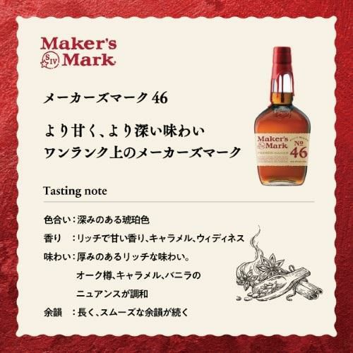 46はメーカーズマーク蒸留所の46番目のレシピに由来。焦げたオークの風味がより一層増し、深みのある味わいに仕上がっています。
