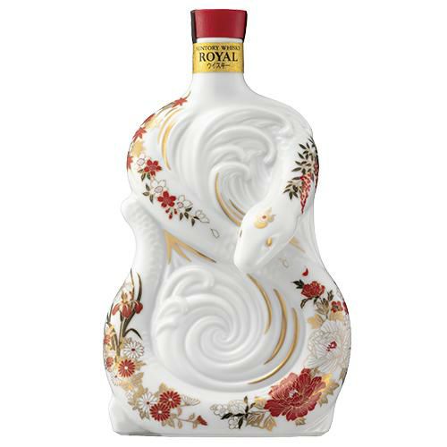 「サントリーウイスキーローヤル〈巳歳〉ボトル」は、「不老長寿」の象徴といわれ、特に幸福を招来し金運を高める神としても祀られている白蛇の姿をモチーフにしました。波立つ水の流れや、花々で春夏秋冬の循環を描くとともに、蛇が持つ強靭な生命力と永遠の発展への願いを表現しました。