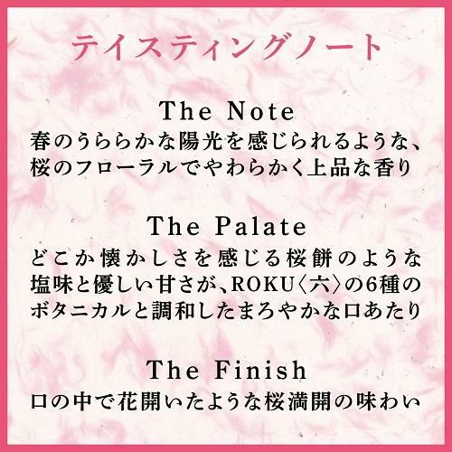 味わい:どこか懐かしさを感じる桜餅のような塩味と懐かしい甘さがROKU<六>の6種のボタニカルと調和したまろやかな口あたり。