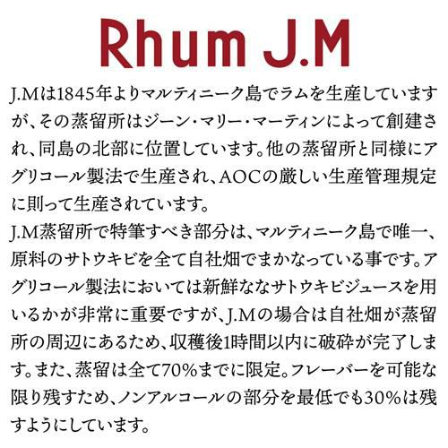 J.Mは1845年よりマルティニーク島でラムを生産していますが、その蒸留所はジーン・マリー・マーティン(蒸留所名の由来は、その頭文字「J.M」から)によって創建され、同島の北部に位置しています。もちろん、他の蒸留所と同様にアグリコール製法で生産され、AOCの厳しい生産管理規定に則って生産されています。