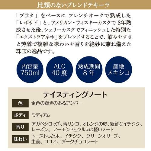 「プラタ」をベースに フレンチオークで熟成した「レポサド」と、アメリカン・ウィスキーカスクで 8年熟成させた後、シェリーカスクでフィニッシュした特別な「エクストラアネホ」をブレンドすることで、飲みやすさと芳醇で複雑な味わいや香りを絶妙に兼ね備えた珠玉の逸品です。
