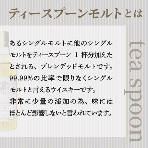 ※ティースプーンモルトはあるシングルモルトに他のシングルモルトをティースプーン1杯分加えたとされる、ブレンデッドモルトです。99.99%の比率で限りなくシングルモルトと言えるウイスキーです。