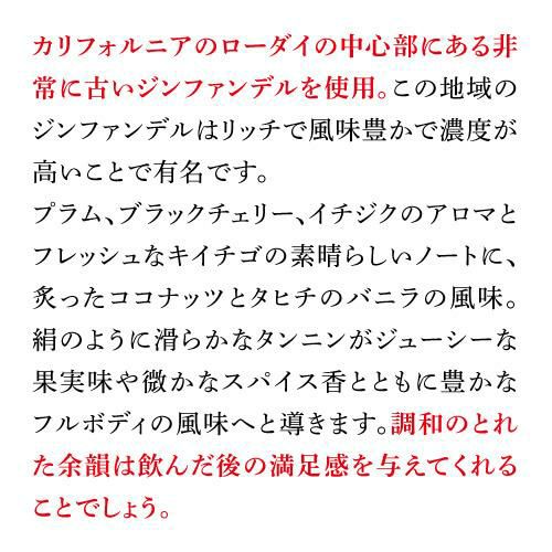 カリフォルニアのローダイ中心部にある非常に古いジンファンデルの木から収穫したブドウを使用。リッチで風味豊かで濃度が高いことで知られています。