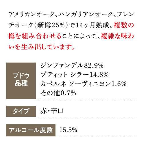 ぶどうの品種(ワイン)ジンファンデル82.9%、プティット・シラー14.8%、カベルネ・ソーヴィニヨン1.6%、その他0.7%