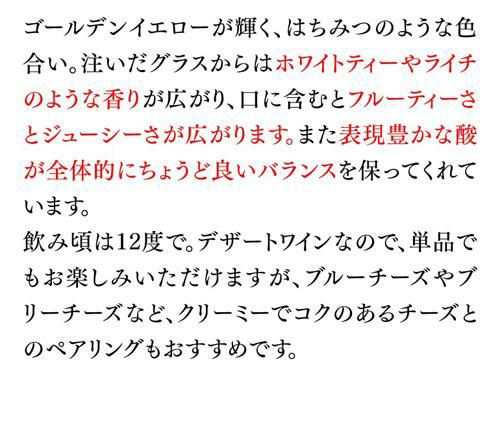 ゴールデンイエローが輝く、はちみつのような色合い。注いだグラスからはホワイトティーやライチのような香りが広がり、口に含むとフルーティーさとジューシーさが広がります。また、表現豊かな酸が全体的にちょうど良いバランスを保ってくれています。