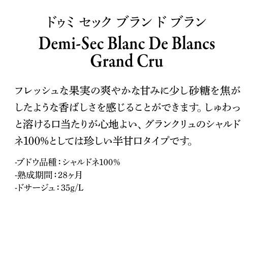 フレッシュな果実の爽やかな甘みと少し砂糖を焦がしたような香ばしさ、しゅわっと溶ける口当たりが心地よい、グランクリュのシャルドネ100%の珍しい半甘口タイプ。