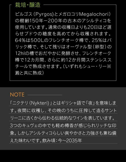 2021年初リリースのキュヴェ「ニクテリ(Nykteri)」エステートアルギロスの古くからある、伝統的なサントリーニスタイルのワインです。