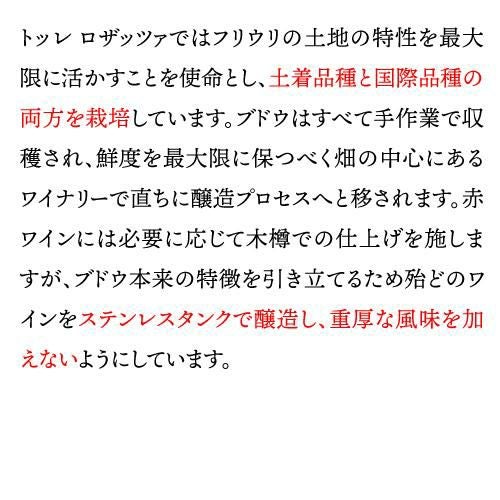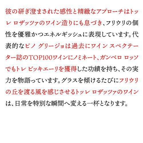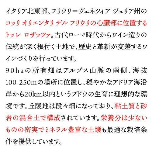 イタリア北東部、フリウリ=ヴェネツィア・ジュリア州のコッリ・オリエンタリ・デル・フリウリの心臓部に位置するトッレ・ロザッツァ。古代ローマ時代からワイン造りの伝統が深く根付く土地で、歴史と革新が交差するワインづくりを行っています。 90haの所有畑はアルプス山脈の南側、海抜100-250mの場所に位置し、穏やかなアドリア海沿岸から20km以内というブドウの生育に理想的な環境です。丘陵地は段々畑になっており、粘土質と砂岩の混合土で構成されています。栄養分は少ないものの密実でミネラル豊富な土壌も最適な栽培条件を提供しています。 トッレ・ロザッツァではフリウリの土地の特性を最大限に活かすことを使命とし、土着品種と国際品種の両方を栽培しています。ブドウはすべて手作業で収穫され、鮮度を最大限に保つべく畑の中心にあるワイナリーで直ちに醸造プロセスへと移されます。赤ワインには必要に応じて木樽での仕上げを施しますが、ブドウ本来の特徴を引き立てるため殆どのワインをステンレスタンクで醸造し、重厚な風味を加えないようにしています。 2014年以来、ワイン造りの指揮を執るのはリカルド・コタレッラ氏。彼はかのアンティノリのチーフ・ワインメーカー兼ディレクターでもあり、ガンベロ・ロッソでベスト・ワインメーカー、ワイン・エンスージアストでワインメーカー・オブ・ザ・イヤーの受賞歴も誇る天才醸造家です。彼の監修のもと、伝統と最新技術を融合させたワイン造りが行われており、トッレ・ロザッツァの繊細なアロマの表現と力強さのバランスは彼の手腕の賜物です。 代表的なピノ・グリージョは過去にガンベロ・ロッソでトレ・ビッキエーリを獲得、ワイン・スペクテーター誌のTOP100ワインにもノミネートされ、その実力を物語っています。グラスを傾けるたびにフリウリの風景や息吹を感じさせるトッレ・ロザッツァのワインは、日常を特別な瞬間へ変える一杯となります。