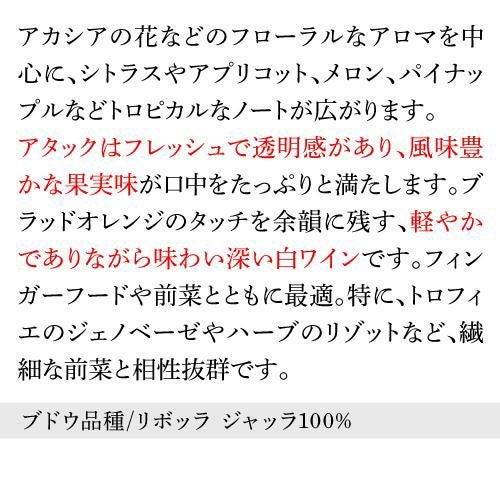 アカシアの花などのフローラルなアロマを中心に、シトラスやアプリコット、メロン、パイナップルなどトロピカルなノートが広がります。アタックはフレッシュで透明感があり、風味豊かな果実味が口中をたっぷりと満たします。ブラッドオレンジのタッチを余韻に残す、軽やかでありながら味わい深い白ワインです。