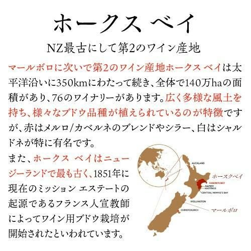 ボルドー系品種の産地として名高いホークスベイ産のメルロは豊かな果実味があり、カベルネフランはスパイシーさが特徴です。