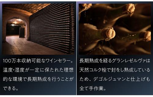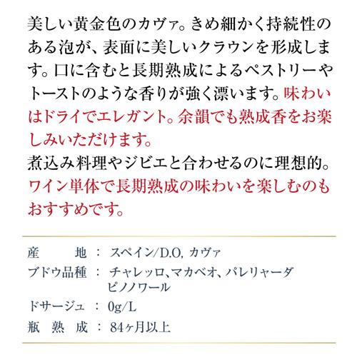 口に含むと長期熟成によって生んだペストリーやトーストのような香りが強く漂います。味わいはドライでエレガント。飲んだ余韻にも長期熟成をお楽しみいただけます。
