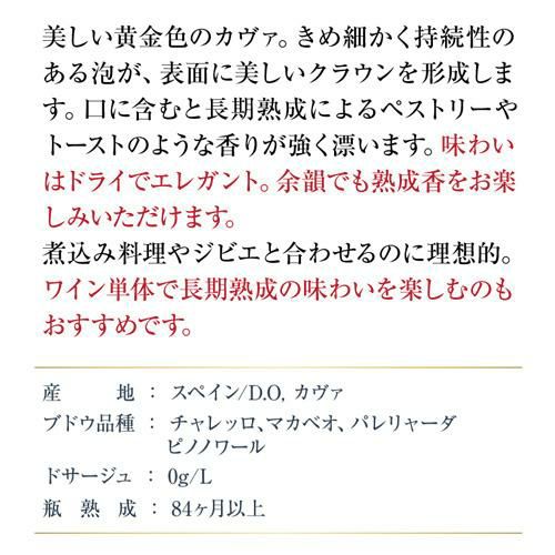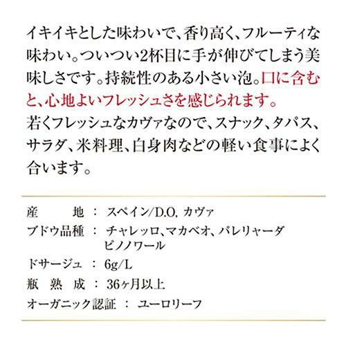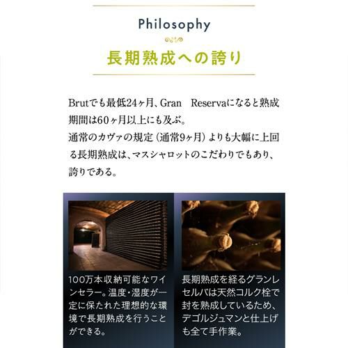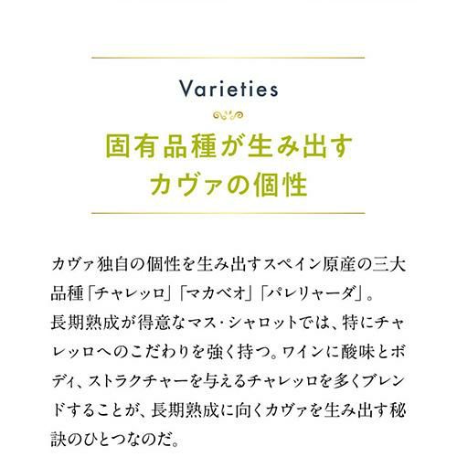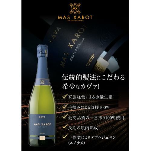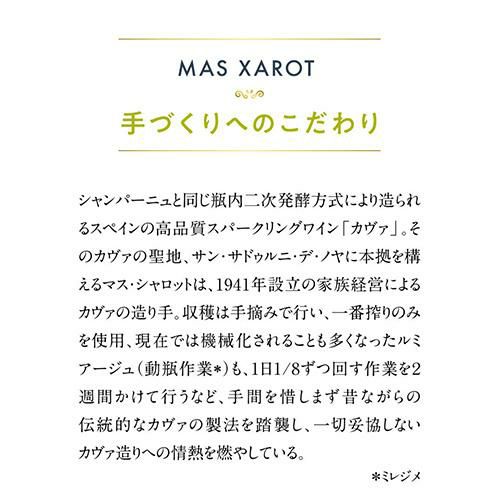 カヴァの伝統製法にこだわるマス・シャロットは、家族経営のワイナリーです。ブドウは全て手摘みし、贅沢に一番搾りのみを使用しています。また、長期の瓶内熟成によって生まれる凝縮感と熟成感からは、品質の高さとクラフトマンシップが感じられます。