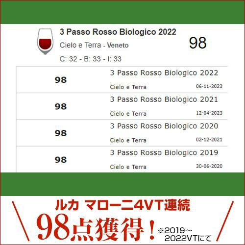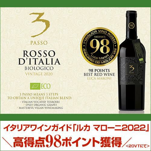 サンジョヴェーゼ50%、ネグロアマーロ50%。有機栽培認証のワイン。南イタリアの熟した果実味と程よいコク。3パッソとは3ステップの意味