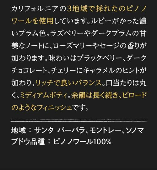 ソノマ、サンタバーバラ、モントレーの3つのエリアの葡萄をブレンド。チェリー、ドライハーブの香り、しなやかでエレガントな余韻を感じられます。