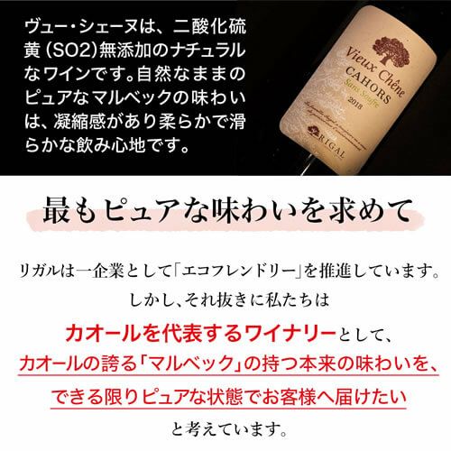 ヴュー・シェーヌは酸化防止剤無添加のピュアなマルベックそのまま味わいです。マルベックのピュアな味わいが凝縮しており、果実の味わい、柔らかな舌触りが口に広がります。酸化防止剤無添加の秘訣は徹底的に醸造工程で空気との接触を避ける点です。特別な酵母と触れさせ、より早く発酵を促します。醸造のすべての工程に不活性ガスを使用しており、ボトリングの際にも使用されているため、酸化防止剤無添加の味わいながらもワインそのままの味わいを楽しむことができます。