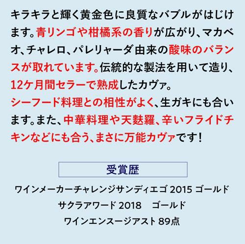 キラキラと輝く黄金色に良質なバブルがはじけます。青リンゴや柑橘系の香りが広がり、マカベオ、チャレロ、パレリャーダ由来の酸味のバランスが取れています。伝統的な製法を用いて造り、12ケ月間セラーで熟成したカヴァ。