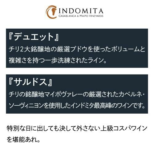 他の画像を見る インドミタ デュエット プレミアム カベルネ ソーヴィニョン&カルメネールカバタッピ80号掲載商品 長S ワインよりどり3本以上5%OFF ワインよりどり6本以上10%OFF ¥ 2,178 税込 お気に入りに登録する
