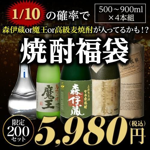 他の画像を見る 【限定200セット】 焼酎福袋 500-900ml×4本セット 18弾 1/10の確率で森伊蔵か魔王か高級麦焼酎が当たるかも!?芋焼酎 麦焼酎 むぎ焼酎 いも焼酎 侍士の門 赤兎馬 四合瓶 虎S ¥ 5,980 税込 お気に入りに登録する 在庫切れ