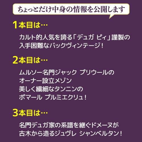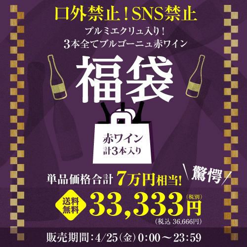 他の画像を見る 単品価格合計71,060円(税込)相当入! (予約) 4/25限定 口外禁止&SNS禁止 銘醸赤ワイン3本 33,333円(税別)福袋 プルミエクリュ入り 赤 ワイン 虎姫 母の日 送料無料 2025/4/29以降発送予定 ¥ 36,666 税込 お気に入りに登録する 在庫切れ 販売を終了しました。