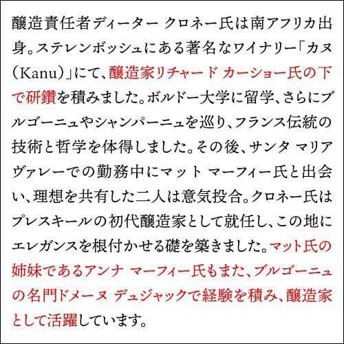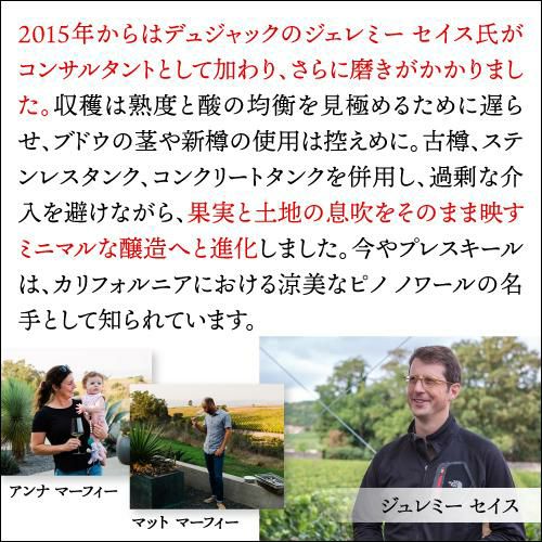 他の画像を見る 柔らかな果実香と凛としたミネラル感を味わう 送料無料 プレスキール ヴィンヤード シャルドネ [2023]プレスキール 750mlアメリカ サンタ バーバラ 辛口 白ワイン 浜運 ワインよりどり3本以上5%OFF ワインよりどり6本以上10%OFF ¥ 9,680 税込 お気に入りに登録する