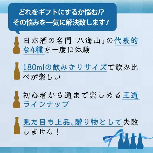 他の画像を見る 日本酒 八海山 飲みくらべ 4選 180ml 4本セット ギフト 箱付き 正規品 新潟県 八海醸造 純米大吟醸 大吟醸 普通酒 特別本醸造 4本 飲み比べ 長S ¥ 3,480 税込 お気に入りに登録する