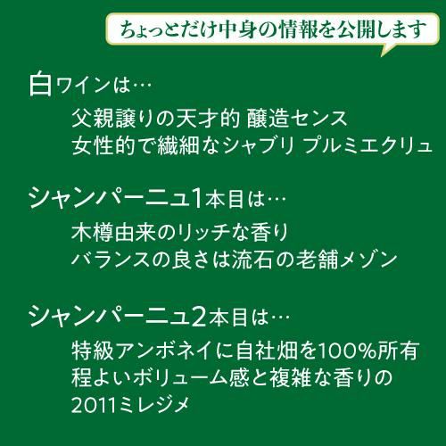 他の画像を見る 3本合計で29,700円(税込)相当のワイン入り! (予約) 【ポイント3倍】送料無料 銘醸ワイン3本入り 1.2万円(税別) 決算福袋 シャンパーニュ2本 白ワイン1本入り おひとり様1セット限定 ワイン福袋 浜運2023/1/17以降発送予定 ¥ 13,200 税込 お気に入りに登録する 販売を終了しました。