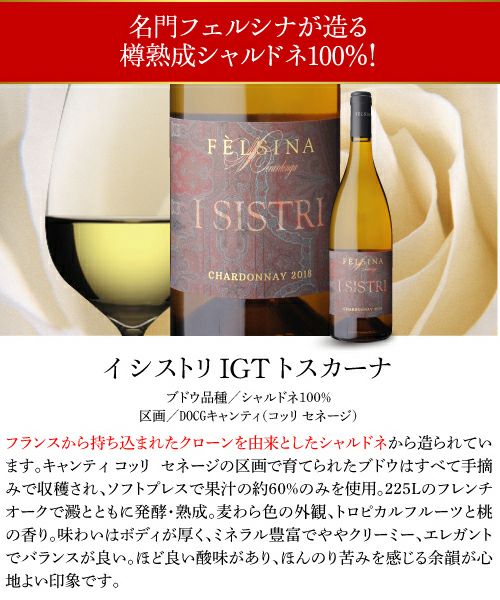 他の画像を見る 名門フェルシナが造る樽熟成シャルドネ100%! イ シストリ 2022 IGT トスカーナ フェルシナ 750ml イタリア トスカーナ スーパータスカン シャルドネ 辛口 白ワイン 浜運A ワインよりどり3本以上5%OFF ワインよりどり6本以上10%OFF ¥ 4,180 税込 お気に入りに登録する