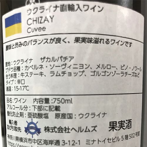 他の画像を見る カルパチア地方では最も高い評価を受けるワイナリー チザイキュヴェ 2020 750mlウクライナ カルパチア ウクライナワイン カベルネ ソーヴィニヨン メルロー ピノ ノワール 辛口 赤ワイン 浜運 ワインよりどり3本以上5%OFF ワインよりどり6本以上10%OFF ¥ 3,124 税込 お気に入りに登録する