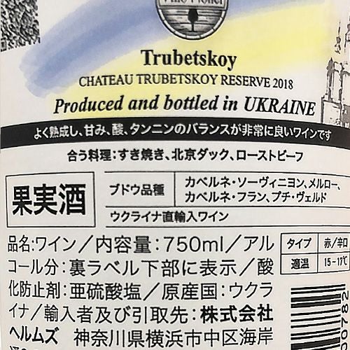 他の画像を見る 欧州で高評価を受ける高品質なウクライナワインを生産 シャトー ツベルツコイ リザーブ 2018ツルベツコイ 750mlウクライナ ヘルソン ウクライナワイン 辛口 カベルネ ソーヴィニヨン メルロー 赤ワイン 虎 ワインよりどり3本以上5%OFF ワインよりどり6本以上10%OFF ¥ 7,150 税込 お気に入りに登録する 在庫切れ