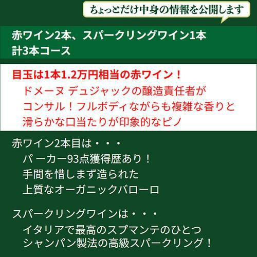 他の画像を見る 3本合計で23,430円(税込)相当のワイン入り! (予約) P3倍 送料無料銘醸ワイン3本1万円(税別)福袋赤ワイン2本(ブルゴーニュ タスマニア)シャンパーニュ1本入り おひとり様1セット限定 ワイン福袋 浜運2023/11/10以降発送予定 ¥ 11,000 税込 お気に入りに登録する 販売を終了しました。