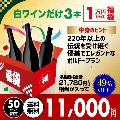 他の画像を見る 220年以上の伝統を受け継ぐ優美でエレガントなボルドーブラン入り 白3本福袋 送料無料 21,780円(税込)相当が入って11,000円(税込)! 白ワインだけ3本 1万円(税別)福袋 2025年 白ワインセット 辛口 ワイン福袋 ワインセット 浜運 お歳暮 御歳暮 ¥ 11,000 税込 お気に入りに登録する 販売を終了しました。