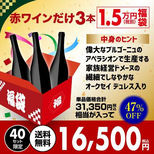 他の画像を見る 家族経営ドメーヌによる繊細なオークセイ デュレス入り 赤3本福袋 送料無料 31,350円(税込)相当が入って16,500円(税込)! 赤ワインだけ3本 1.5万円(税別)福袋 2025年 赤ワインセット 辛口 ワイン福袋 ワインセット 浜運 お歳暮 御歳暮 ¥ 16,500 税込 お気に入りに登録する 販売を終了しました。