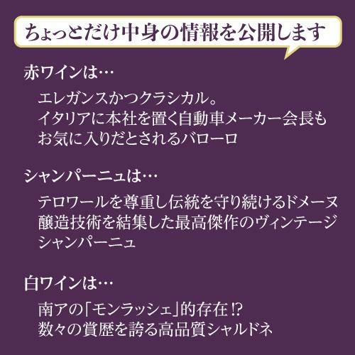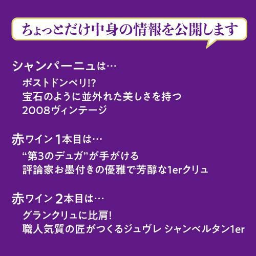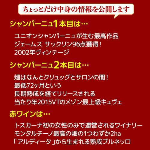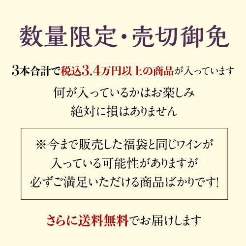 他の画像を見る 3本合計で78,100円(税込)相当のワイン入り! (予約)【ポイント3倍】送料無料 銘醸ワイン3本入り 3万円(税別) 福袋 シャンパーニュ1本 赤ワイン2本入り おひとり様1セット限定 ワイン福袋 長S2023/2/7以降発送予定 ¥ 33,000 税込 お気に入りに登録する 在庫切れ 販売を終了しました。