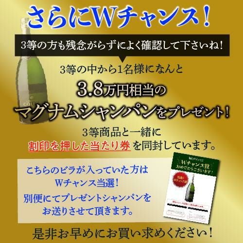 他の画像を見る 高級シャンパン を探せ! 特賞は3種類!決算シャンパンくじ 超レアシャンパンが当たるかも!?【先着300セット】 シャンパン シャンパーニュWくじ リカーマウンテン 福袋お一人様3本まで 【送料別】 ¥ 7,777 税込 お気に入りに登録する 在庫切れ 販売を終了しました。