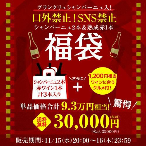 他の画像を見る 3本合計で93,500円(税込)相当のワイン入! 11/15 20時販売開始送料無料口外禁止&SNS禁止 シャンパーニュ2本&赤ワイン1本 3万円(税別)福袋 おまけ付 シャンパン 赤 ワイン 浜運 ¥ 33,000 税込 お気に入りに登録する 在庫切れ 販売を終了しました。