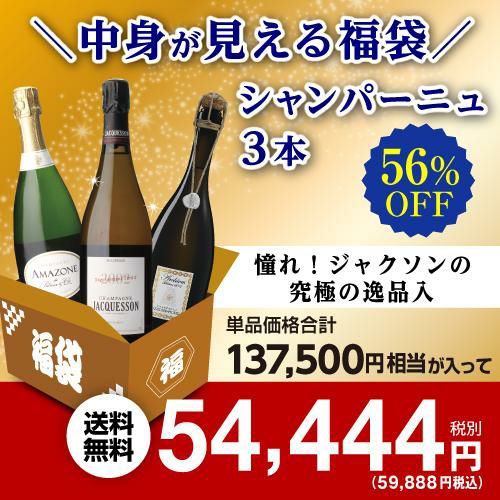 他の画像を見る 3本合計で137,500円(税込)相当のワイン入り! 送料無料 中身が見える シャンパーニュ3本 54,444円(税別)福袋ワイン福袋 シャンパン 虎 年末年始 クリスマス お歳暮 御歳暮 ¥ 59,888 税込 お気に入りに登録する 在庫切れ 販売を終了しました。