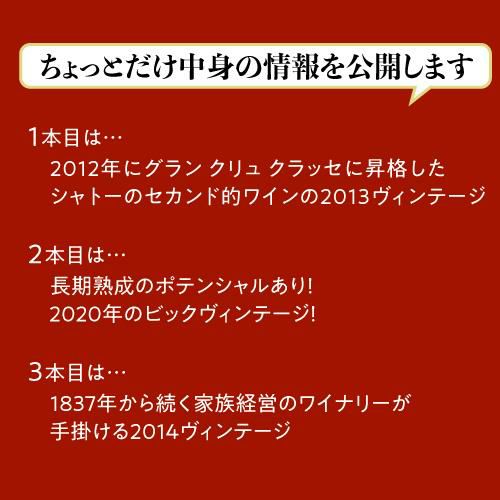 他の画像を見る 3本合計で19,800円(税込)相当のワイン入り! (ポイント3倍)(予約)【3,000円OFFクーポン使える】送料無料 AOC サンテミリオングランクリュ 3本1万円(税込)福袋赤ワイン 3本入りワイン福袋 浜運2023/5/9以降発送予定 ¥ 10,000 税込 お気に入りに登録する 在庫切れ 販売を終了しました。